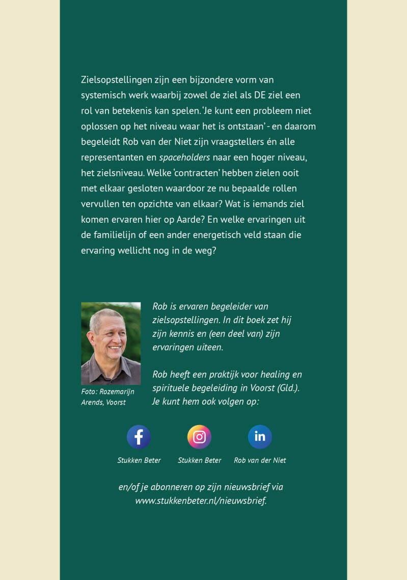Het boek eindigt met een uitgebreid hoofdstuk over zielsopstellingen. Ik leg duidelijk uit hoe ik hiermee werk en wat de meerwaarde is van het opstellen van zielen in het systemisch veld. Ook geef ik meerdere voorbeelden uit mijn eigen praktijk als opsteller, om af te sluiten met een aantal reviews van mensen die al eens een zielsopstelling hebben bijgewoond, als vraagsteller, als representant of beide.